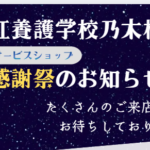- 感謝祭~乃木校舎サービスショップ~感謝祭は、乃木校舎サービスショップの見どころを気軽に楽しめるイベントです。地域のみなさまへ日頃の感謝を込めた特別な催しです。開催は、1月30日(金)31日(土)、乃木校舎です。