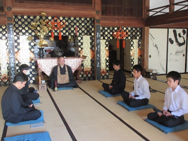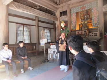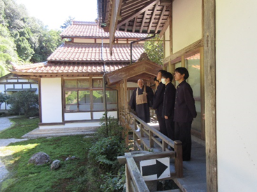 〇10月30日(木)、2年生5名が安来市にある雲樹寺で座禅体験を行いました。700年の歴史を持つ雲樹寺の住職さんにご案内いただき、山門を通り、ご本尊であるお釈迦様が祀られている仏殿へ向かいました。天井には雲龍の絵が描かれた仏殿で、お釈迦様に見守られながら、「みんなは『人』ですか?それとも『人間』ですか?」と問いかけられました。住職さんは、「『人』は生物としての名前。一方、『人間』は人としての生き方を示し、『人と人の間にいる』ことを意味します。皆さんは、周りの人たちだけでなく、人ではないものからも見守られています。だから、一人でいても孤独を感じる必要はないのですよ」と教えてくださいました。その後、本堂に移動し、お釈迦様への挨拶として全員でお経を唱えました。初めてお経を唱える生徒もいましたが、住職さんに合わせて皆一生懸命取り組みました。住職さんの楽しく、心に響くお話を聞きながら、座禅が始まりました。座禅中には、「今日家を出てから学校に着くまでに出会った人、すれ違った人の数、もし挨拶をするならどのタイミングが適切だったか、などを思い出してみましょう」と言われ、今朝の出来事を振り返る時間となりました。休憩時間には、「座った後は歩くのも大切だよ」とのお言葉で、住職さんから庭園の説明を受けながら回廊を歩きました。後半の座禅では、「生まれて物心ついた時からこれまでに出会った人たちの顔を思い浮かべてみましょう」と言われ、これまでの人生を振り返り、見つめ直す時間になりました。生徒たちからは「心に響く話ばかりでとても勉強になった」「自分の記憶の中を深く掘り下げて見つめ直すことができた」「座禅を長く続けるのは大変だと感じた」といった感想が聞かれました。