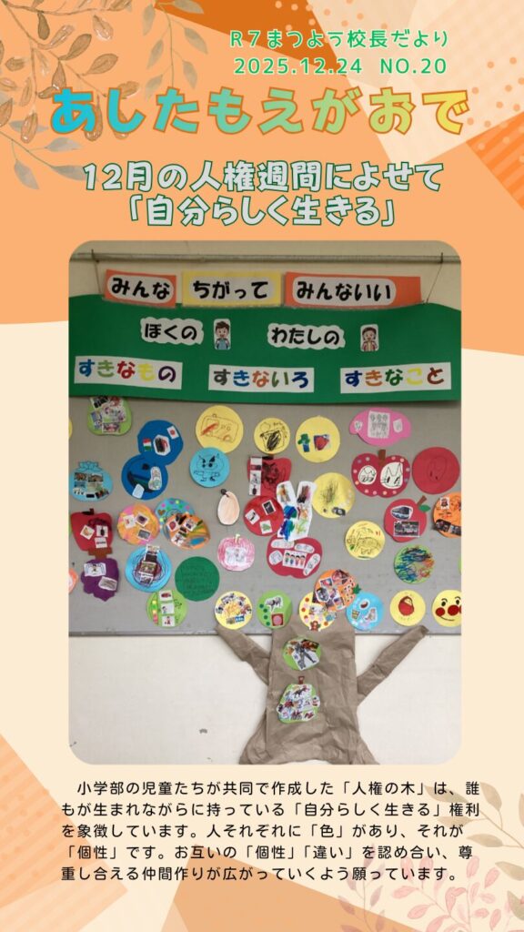 小学部が制作した「人権の木」は個性の象徴。互いの違いを認め、尊重し合える仲間作りを願っています。