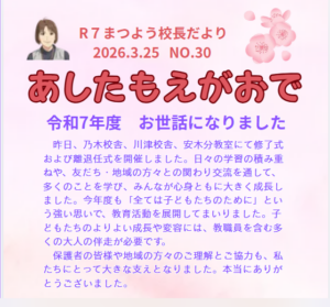 令和7年度末保護者アンケートの結果と検討内容について【保護者向け配信】 2026年3月26日 Last updated : 2026年3月26日 松江養護学校管理者 令和7年度末保護者アンケートの結果と検討内容についてについて配信しました。 「保護者ページ」よりスクールメールに配信されたホームページパスワードを入力していただくと見ることができます。。 「保護者ページ」はこちらから