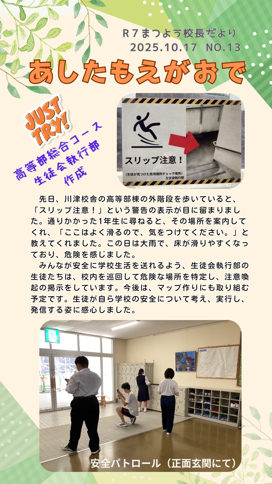 「こども基本法」の理念を踏まえ、子どもたちの権利、最善の利益を中心において、子どもたちの意見や参画の機会を大事にする学校づくりに努めてまいります。