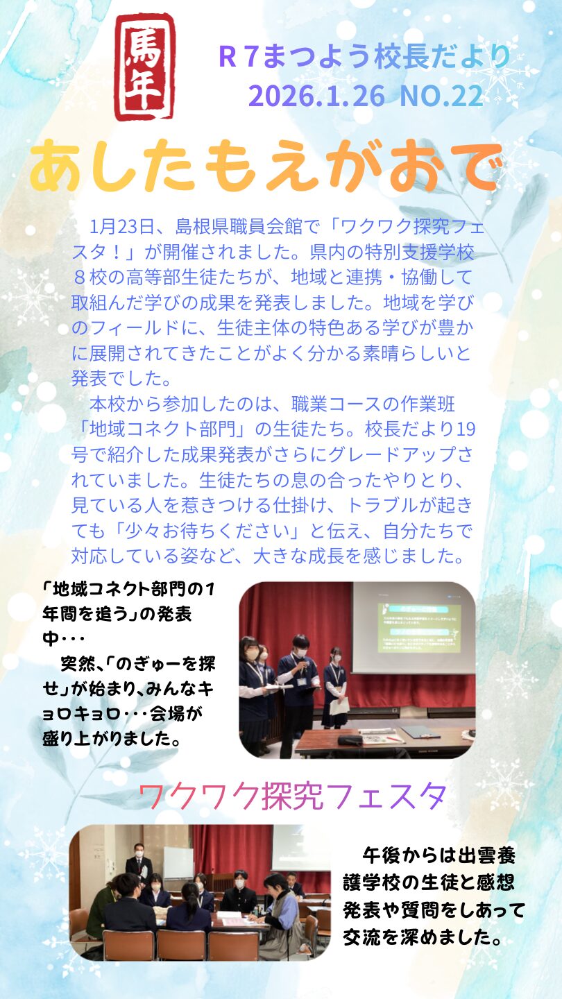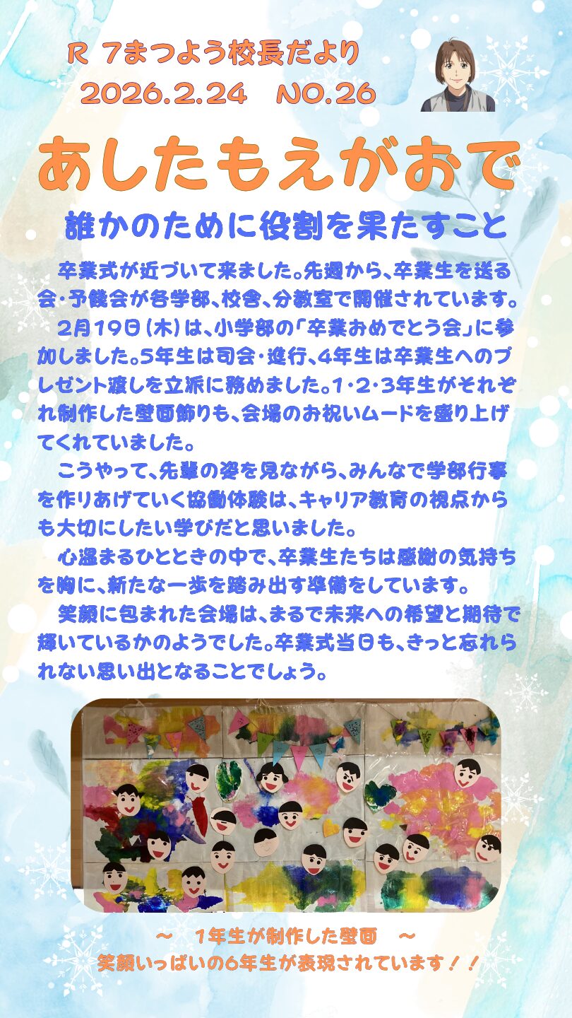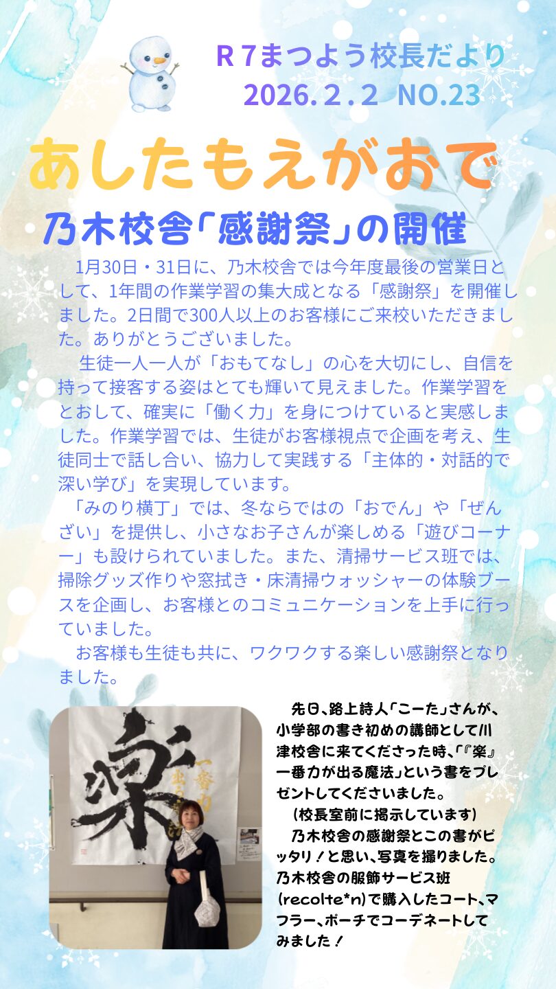 「すべては子どもたちのために」の思いを胸に、共生社会の形成に向け、地域と連携・協働した教育活動の更なる充実を図ってまいりますので、引き続きよろしくお願いいたします。